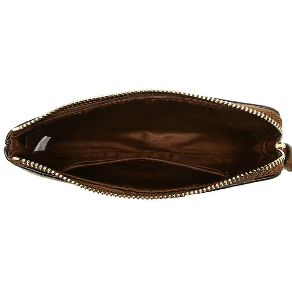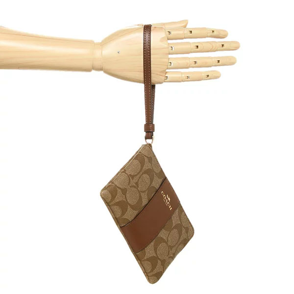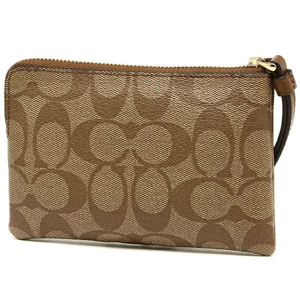 Coach Wristlet In Gift Box Small Wristlet Corner Zip Wristlet In Signature Coated Canvas With Leather Stripe Khaki / Saddle Brown # F58035