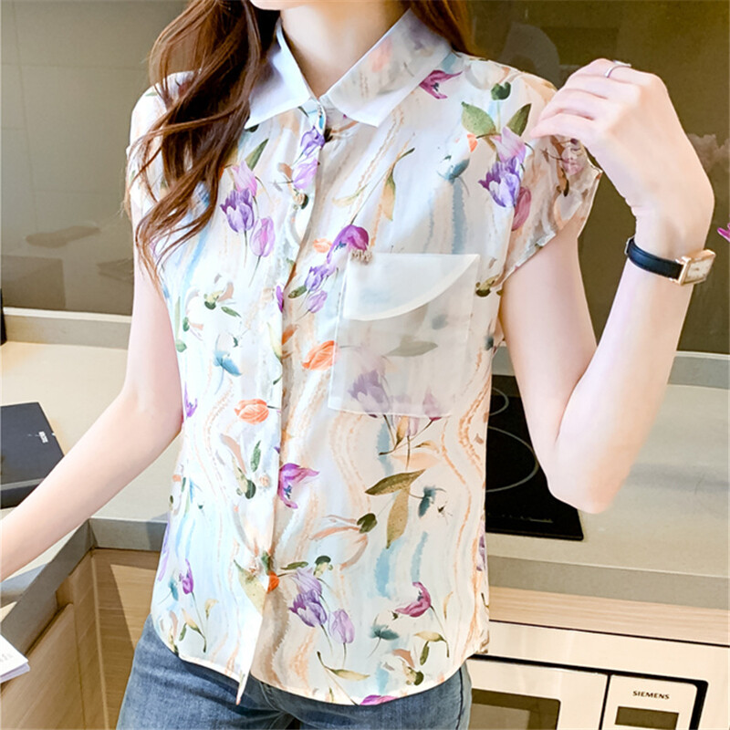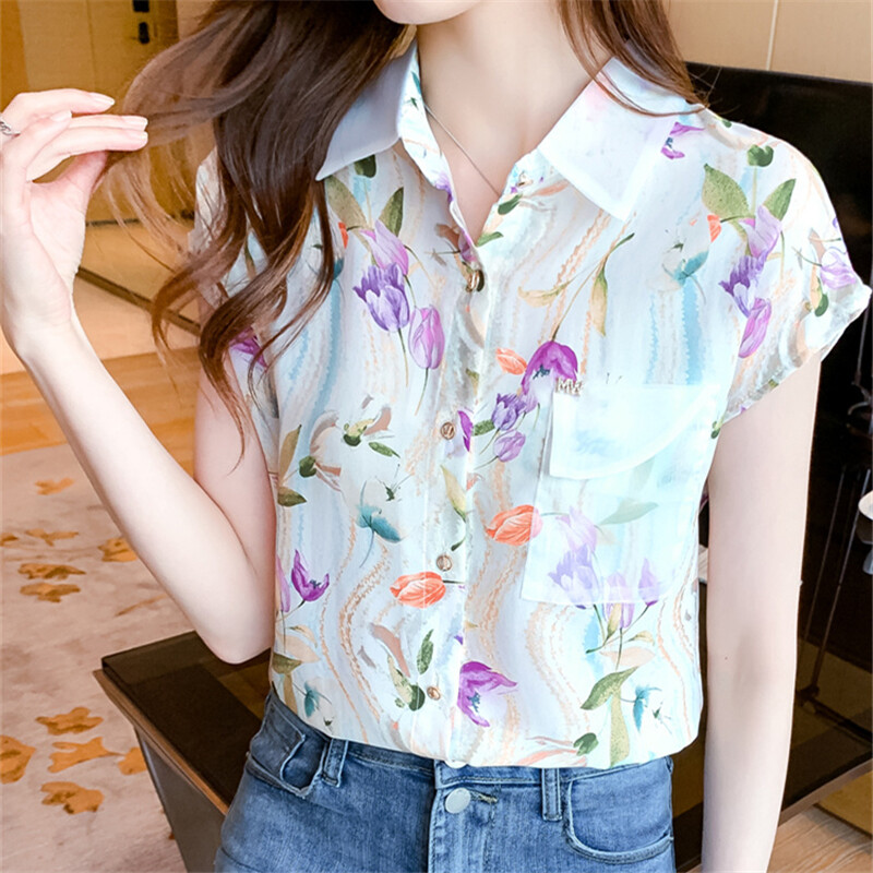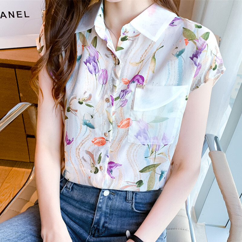 Casual Shirt Women Korean Style Plus Size Loose Top Chiffon Short Sleeve Floral Blouse Summer Shirts