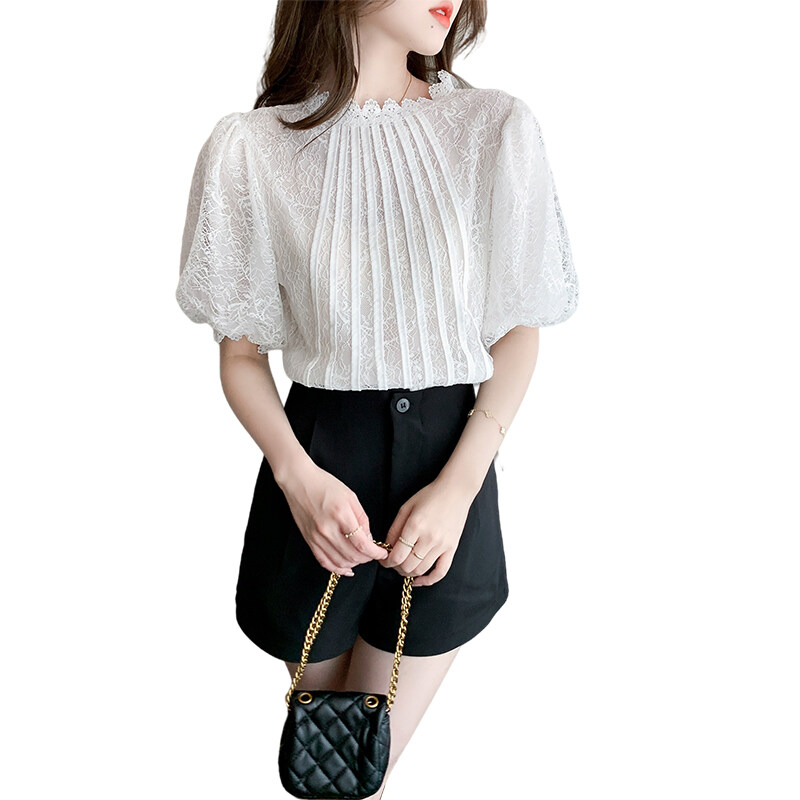 AFEG Korean style women's short-sleeved round neck lace blouse for women