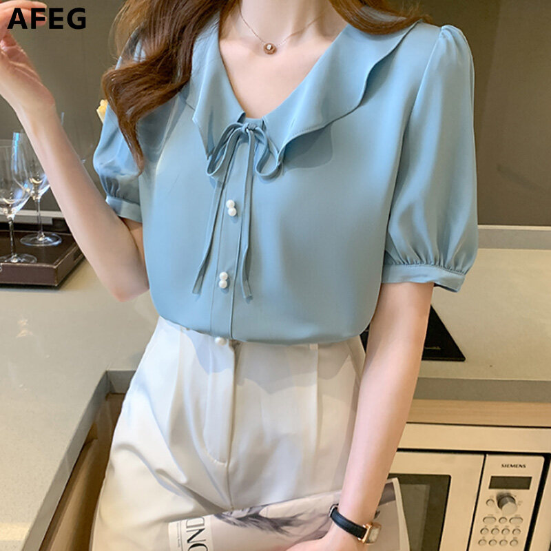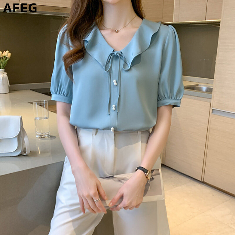 AFEG Korean style women's short-sleeved V-neck chiffon blouse for women