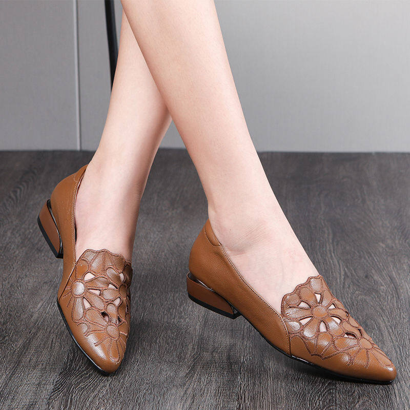 Soft Leather Soft Surface Hollow Embroidered Single Shoes Women New Summer and Autumn Low-heel Mother Women's Shoes Breathable Work Women's Sandals