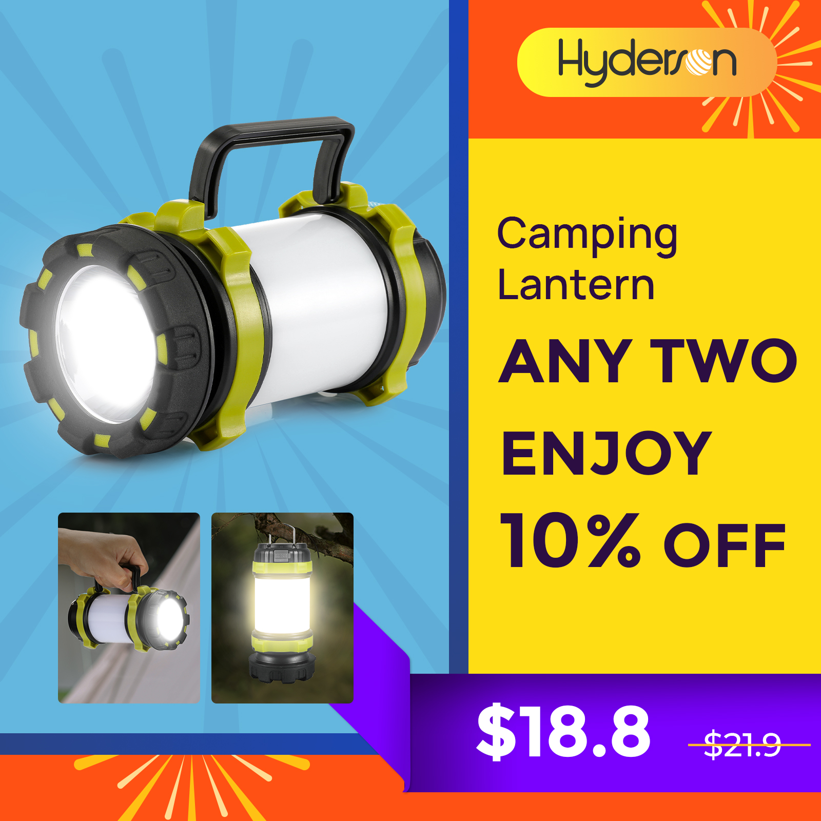 Shorter and smaller than an outdoor bottle, weighed no more than 347g (0.74lb), this portable LED camping lantern is easy to carry and pack. It is designed with a carry handle and two-way hook. You can hang it on tent, backpack, and branches. Free your hand and save your space.