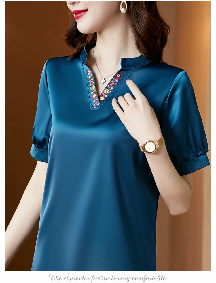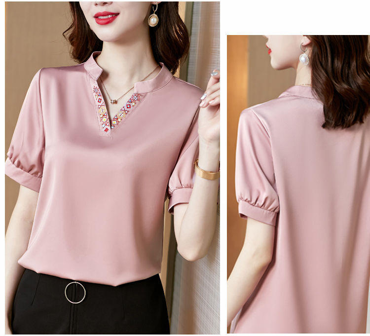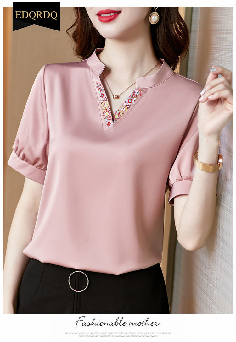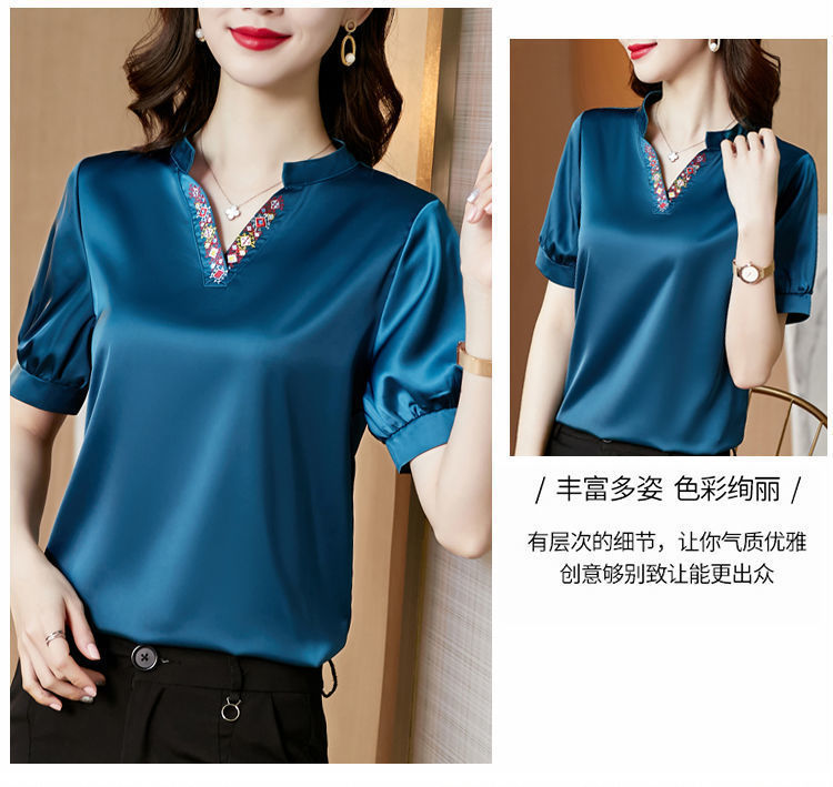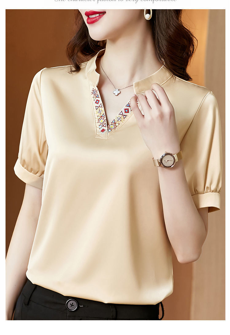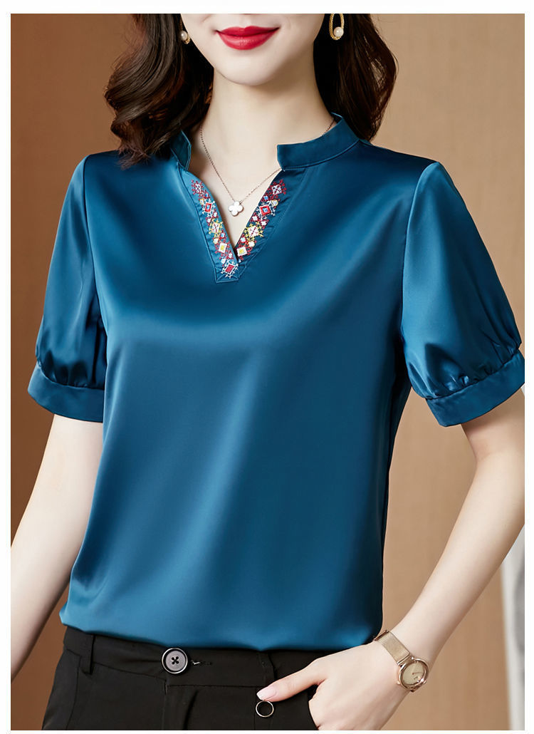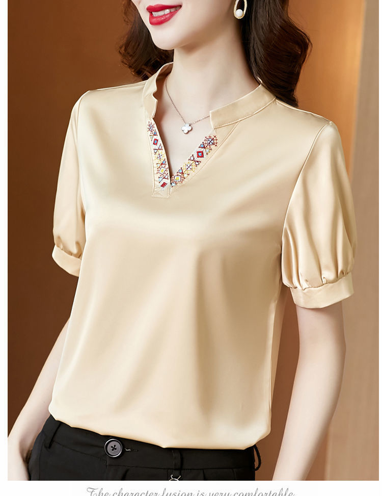 EDQRDQ Women's Satin Blouse Puff Sleeve Saint V Neck Embroidered Short Sleeve Shirt
