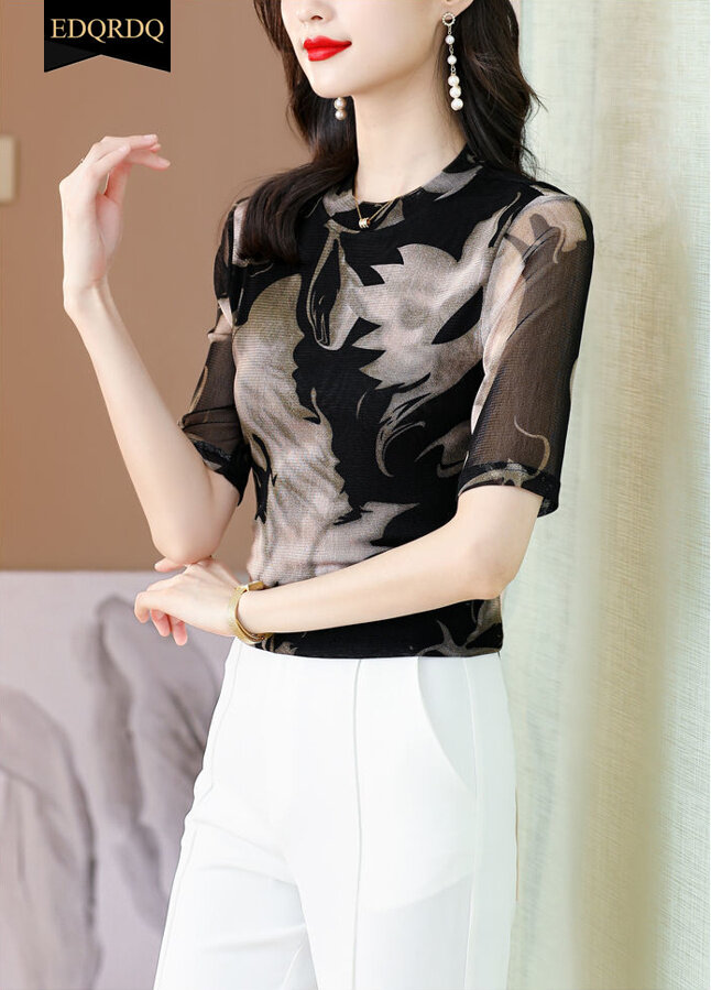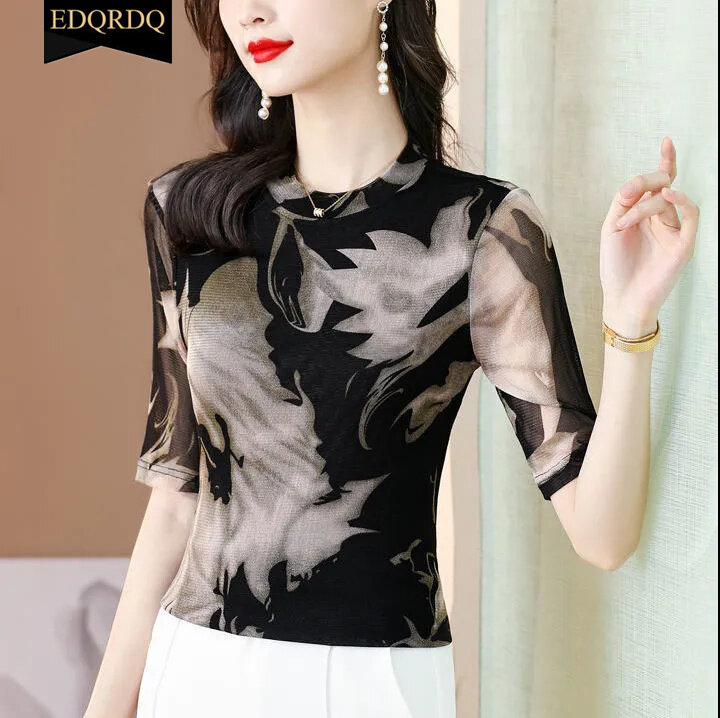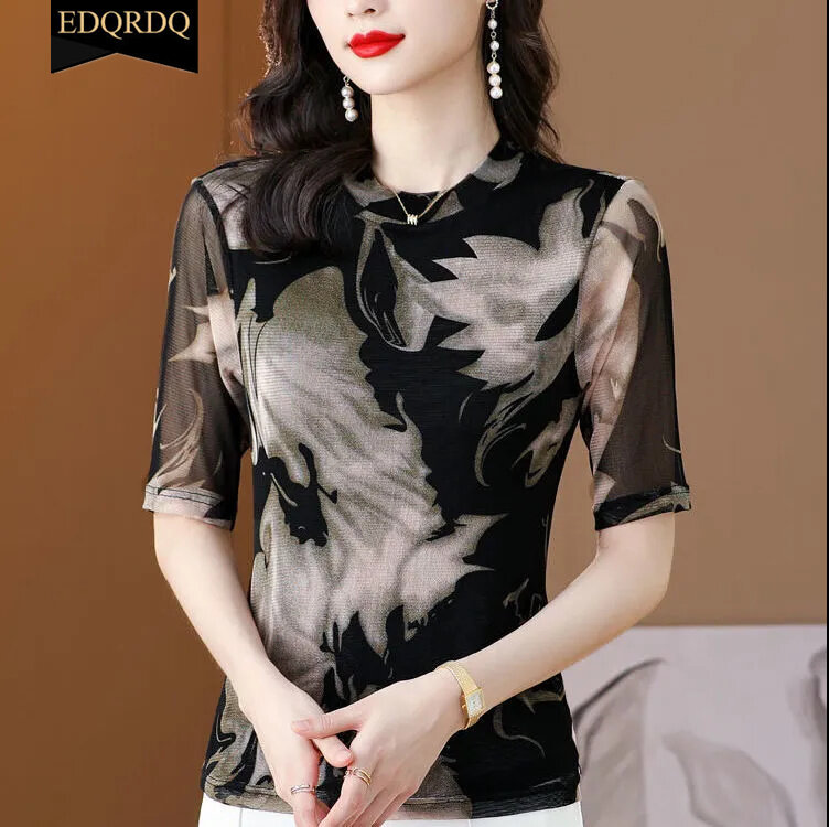EDQRDQ Women's Tie Dye Mesh Tee Fashion Casual Shirt 3/4 Sleeve Fit Top