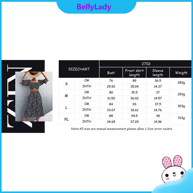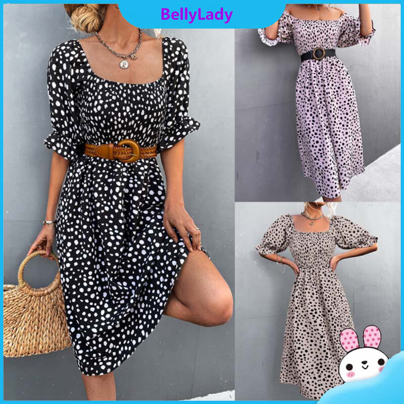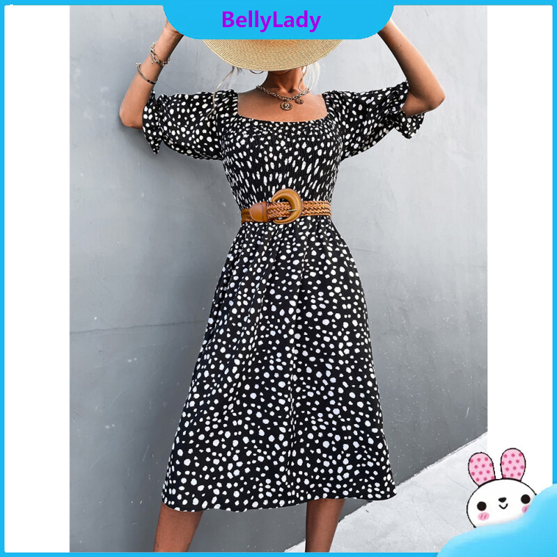 Women Retro Square Collar Dress Polka Dot Printing Puff Sleeve A-line Skirt High Waist Half Sleeves Dress