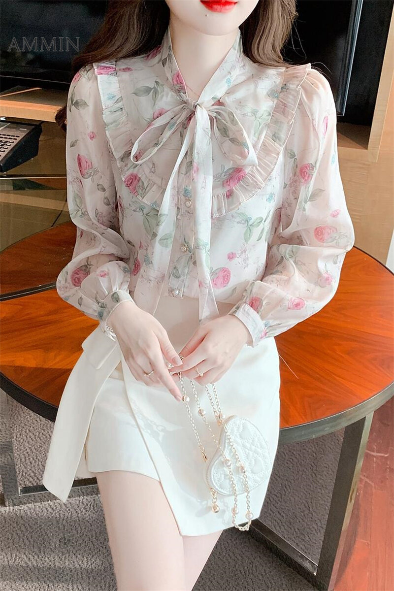 AMMIN Korean-style Women's Long sleeve fashion Gentle wind elegant floral chiffon top 2022 Fall wear new puffed sleeve Ruffle bow Temperament printed chiffon Tops casual Blouse