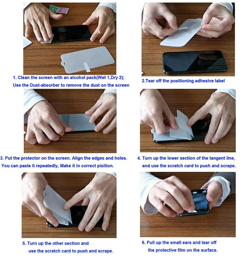 1. Be in a still environment (switch off fan). Clean and dry phone screen using wet then dry wipes provided. Use the dust sticker provided to remove any dust.