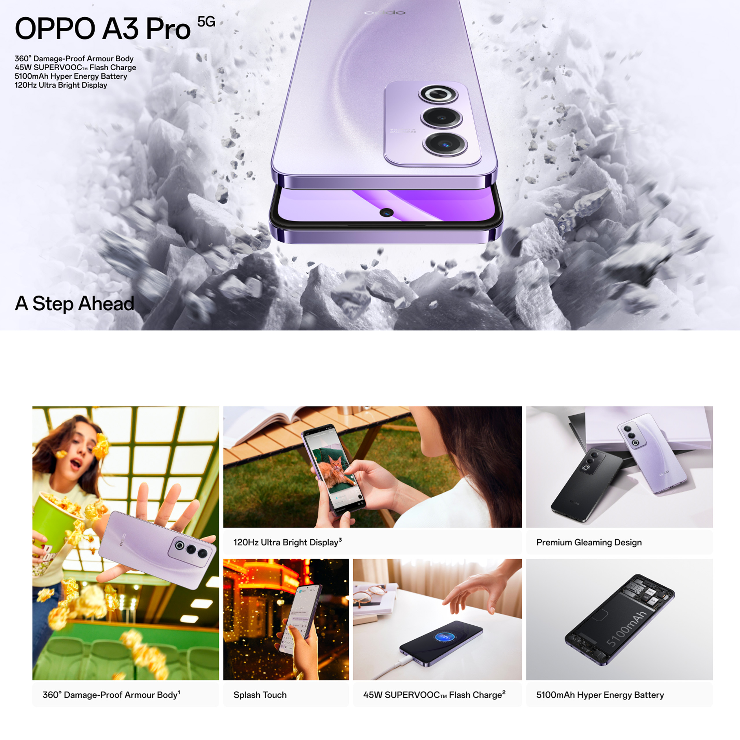 OPPO A3 Pro 5G 16(8+8GB) + 256GB / 360° Damage-Proof Armour Body / 45W SUPERVOOC Charge / 5100mAh Battery / Splash Touch / 2 Years Local Warranty + 2 Years Screen Care
