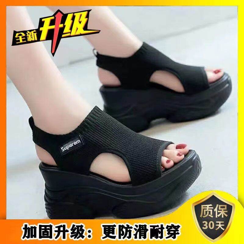 2022 Summer New 8cm Peep Toe Shoes Fairy Style Platform High Heel Flyknit Slanted Heel Platform Sports Women's Sandals