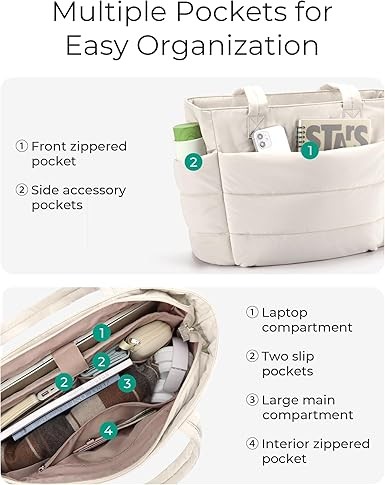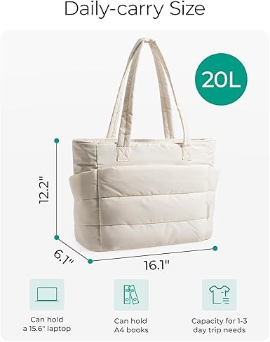 The puffer bag is coming of age: "A puffer bag effortlessly complements any outfit," says Brenda Iris, image consultant, stylist, and founder of Mindful Styling in Minneapolis, Minnesota. Compact Size: Standard dimensions: 16.1" L x 6.1" W x 12.2" H. Ultra-thin: 13.2" L x 5.1" W x 15.7" H. Capacity: 20 liters. This quilted tote is suitable for everyday essentials such as a 15.6" laptop, umbrella, water bottle, power bank, clothes, shoes, and more. The zipper design ensures security.